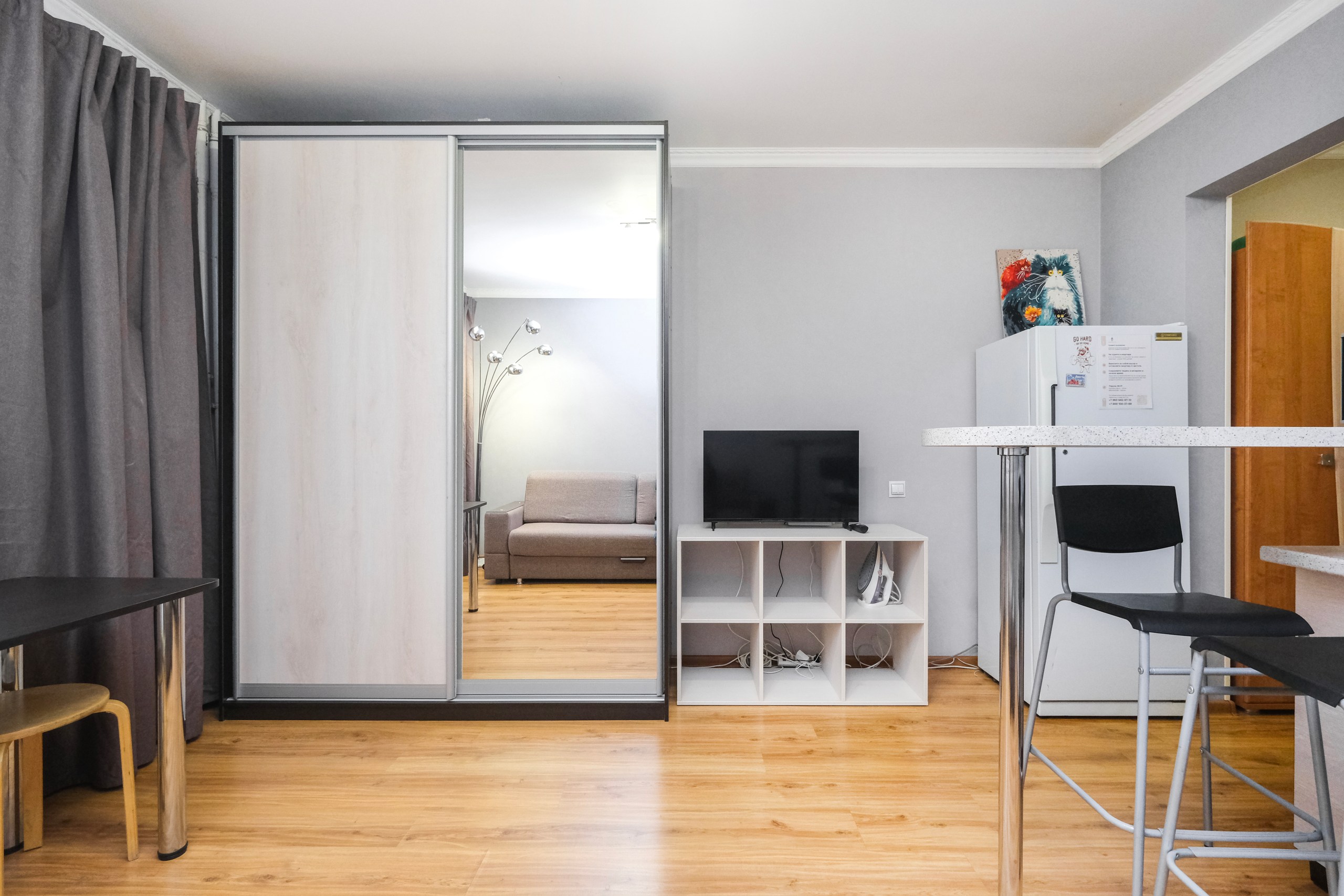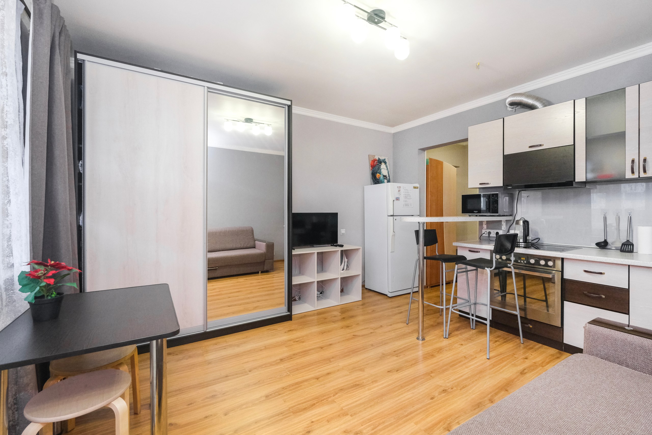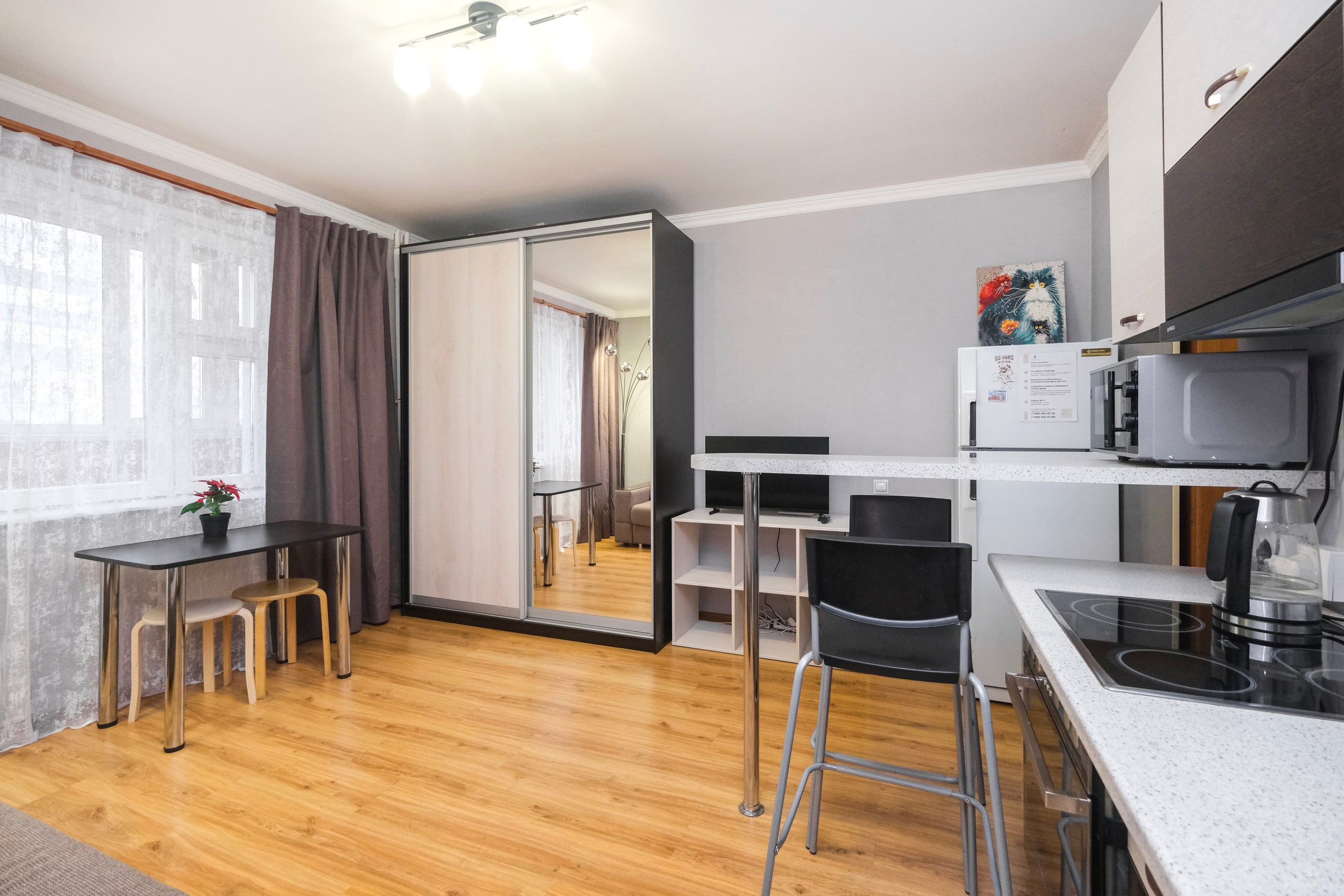 удобный диван-кровать, цифровое TV, машинка-автомат, Wi-Fi, индивидуальный гигиенический набор, чистое постельное белье и полотенца, тапочки, фен, утюг, обустроенная кухня со всей необходимой техникой и все, что нужно, чтобы почувствовать себя как дома.
